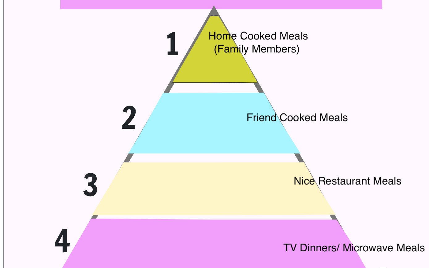 I think food will be valued in a pyramid tier shape. Up on the to is family made meals, then a friend who made a meal, then a good restaurant, and a fast food restaurant, then TV dinner at the bottoms tier.
